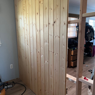 Built 50 Square foot walk in closet in large bedroom. Interior is stained pine shiplap and includes five eight foot by sixteen inch shelves and multiple storage bins.